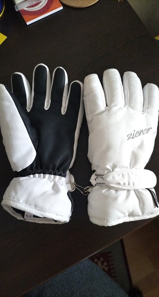 Yumuşak polar astarlı, Velcro kayışlı beyaz kadın kayak eldiveni. Rahat sıcaklık ve biker tarzı sunar.
