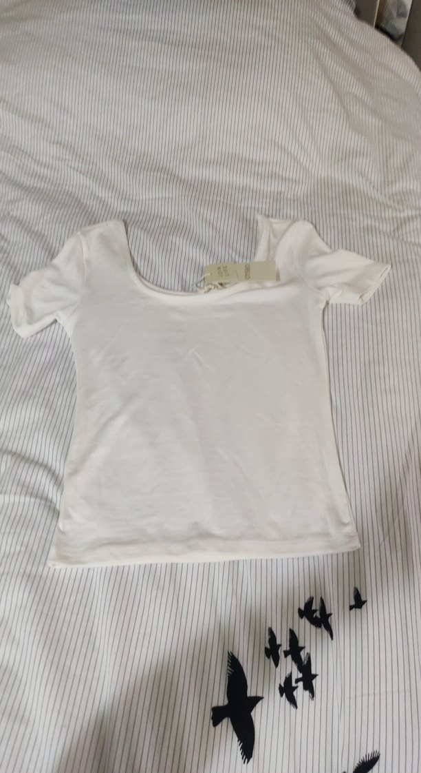 Beyaz pamuklu, kayık yaka ve kısa kollu, vücuda oturan minimalist ve trend günlük stil tişört.