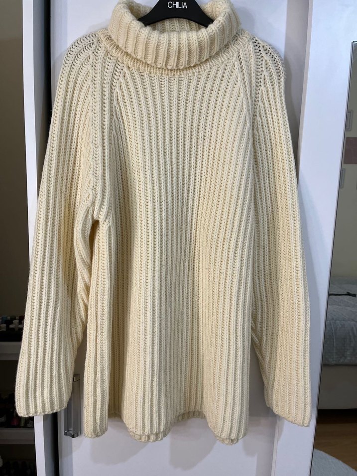 Beyaz renkli, boğazlı ve uzun kollu kadın triko kazak, gevşek kesimi ve midi boyuyla gündelik kullanıma uygundur. Düz ve örme yapısı ile konforludur.