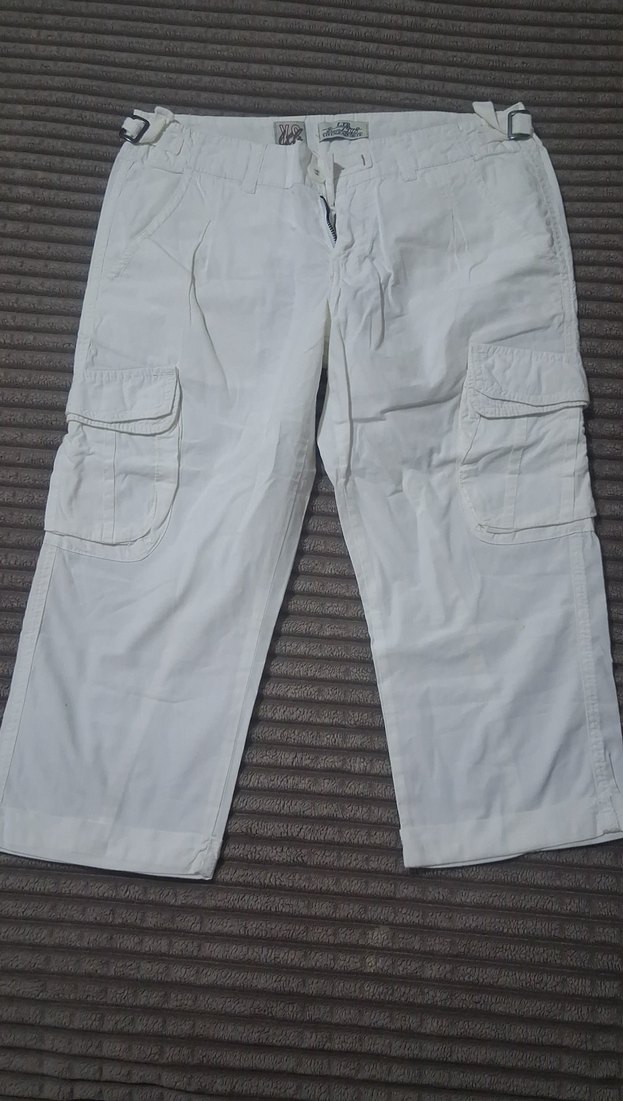Kadınlar için beyaz pamuklu, kemerli ve bol kesim midi pantolon, sokak stili ve açık hava kullanımı için uygun.