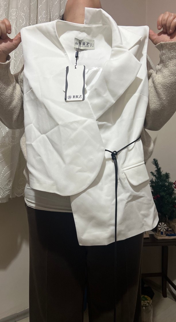 Beyaz kolsuz blazer, kemerli ve notched lapel yakalıdır. Hafif keten kumaştan, günlük sokak stili için minimal ve şık bir tasarım. Marka: BRZ.