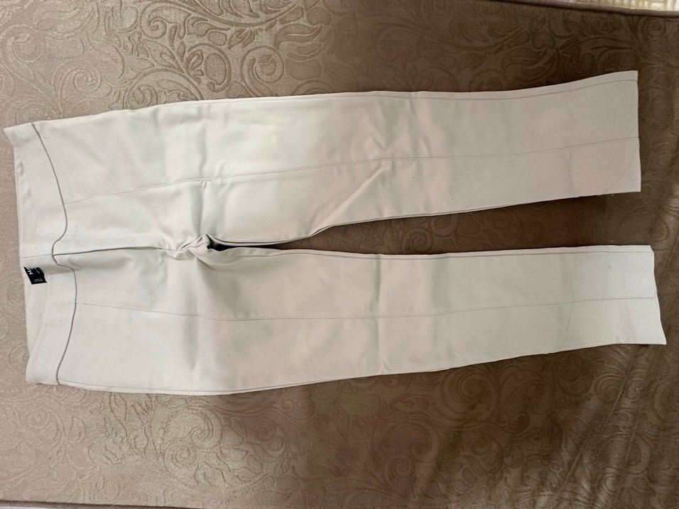 Beyaz, kemerli, düz kesim kadın kumaş pantolon. Normal boyda ve sentetik dokulu kumaştan, minimalist günlük kullanıma uygun.