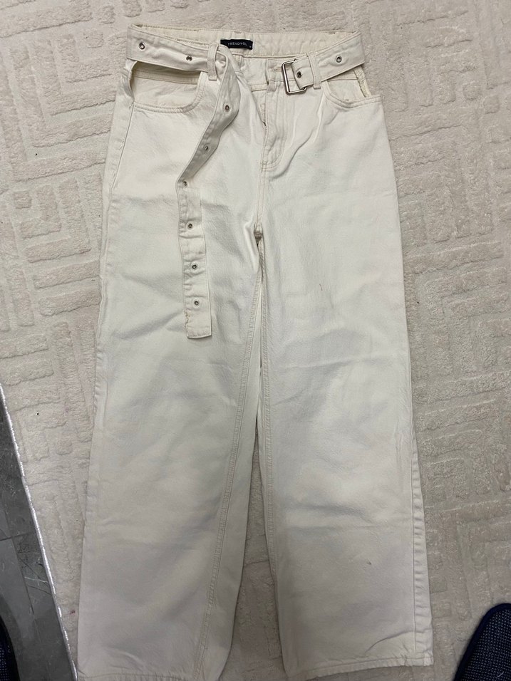 Pamuklu kumaştan, kemerli ve normal boy midi kesim kadın beyaz kot pantolon. Günlük sokak stili için uygun rahat tasarım.