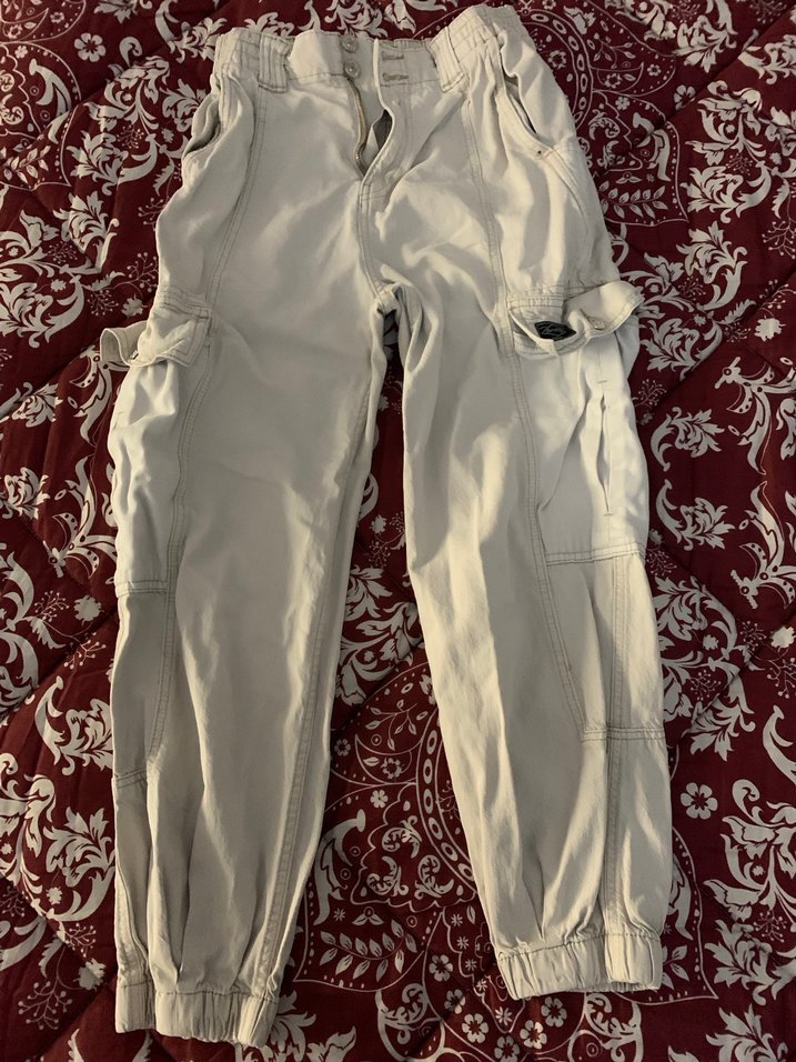 Beyaz pamuklu, kemerli ve lastikli paçalı bol kesim pantolon. Rahat ve günlük kullanım için uygun. Ütüsüz olduğu için kusura bakmayın