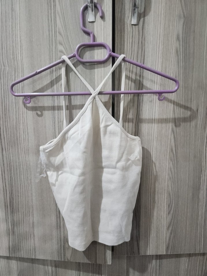 Kadınlar için keten kumaştan yapılmış, askılı ve halter yaka tasarımlı beyaz mini atlet. Minimalist ve sokak stiline uygun, günlük kullanıma ideal.