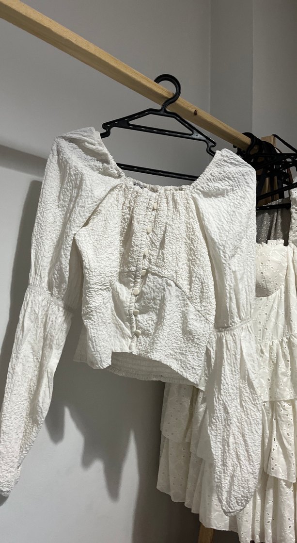 Beyaz keten bluz, düğmeli, uzun kollu ve tekne yakalıdır. Salaş kesimi ve midi boyu ile bohem ve Paris tarzını yansıtır.