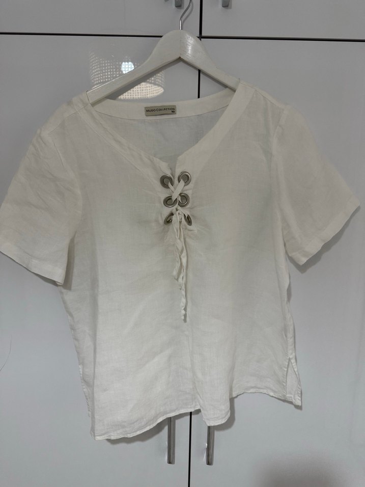 Beyaz keten, kısa kollu, düğmeli ve V yakalı bohem tarzda kadın bluz. Rahat kesimi ve nakış detaylarıyla günlük kullanıma uygundur.