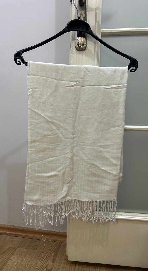 Kadınlar için beyaz ve hafif gri tonlu, yumuşak keten kumaştan yapılmış, püsküllü kenarları ve drapeli tasarımıyla bohem tarzda şal.