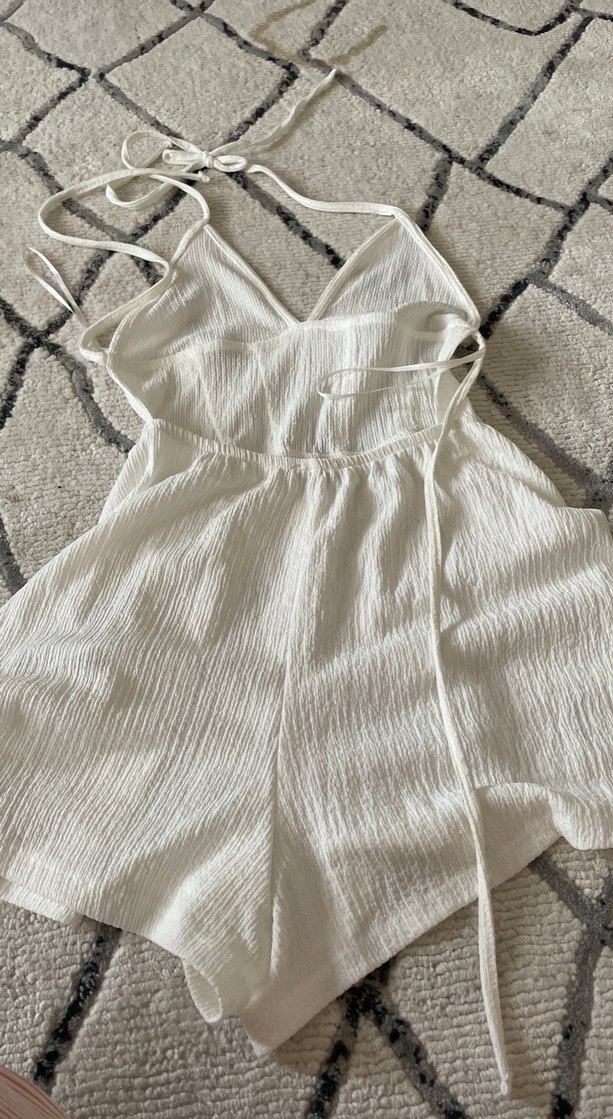 Beyaz keten kumaştan, askılı ve dantel detaylı, rahat ve şık bohem tarzda, günlük kullanıma uygun, vücuda oturan tulum.