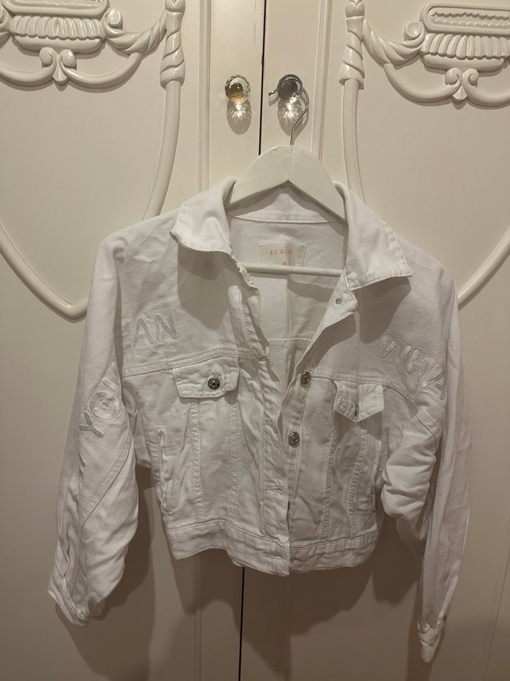 Bol kesim, uzun kollu beyaz keten denim ceket. Notlu yaka ve düğmeli kapama ile midi boyda, sokak stiline uygun. Kolunda hafif nakış detayları bulunur.