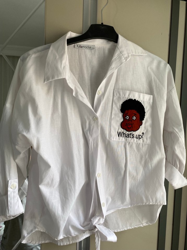 Beyaz keten gömlek, yakalı ve kısa kollu, cepte "What's up?" yazılı baskılı desenle, rahat kesimlidir. Günlük sokak stili için uygun.