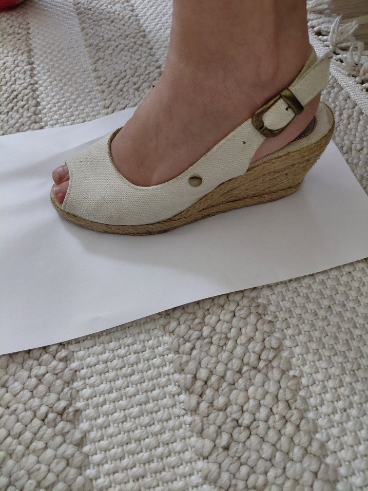 Beyaz keten dolgu topuklu sandalet, tokalı kayışlı, günlük kullanıma uygun açık ve desensiz tasarım. 33 numaradır. #kadın #topukluayakkabı