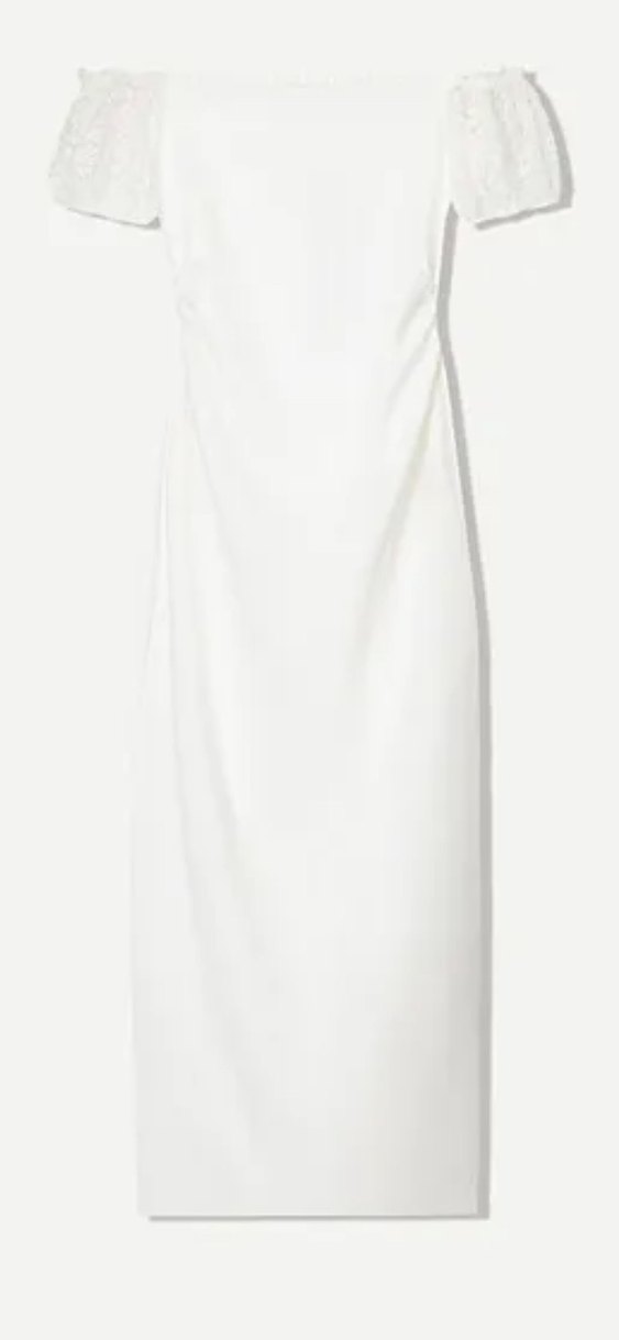 dar ve kayık yaka detaylı, dantel kol detaylı uzun elbise. Minimalist ve çağdaş tarzıyla düğünler için uygundur.
