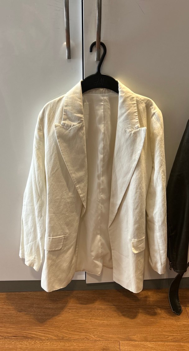 Beyaz keten kumaştan, düğmeli, uzun kollu ve normal boyda, notched lapel yaka detaylı kadın blazer. Ofis ve sokak stiline uygun.