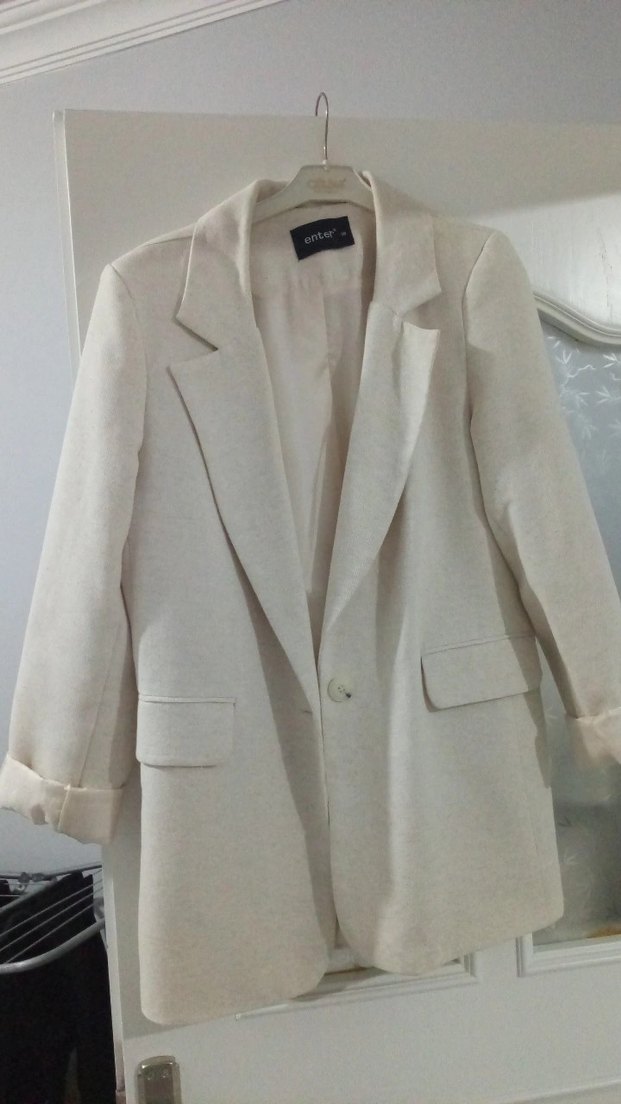 Kadınlar için keten kumaştan yapılmış, düğmeli ve kesimli yakalı beyaz blazer ceket. Normal uzunlukta, uzun kollu ve regular fit modeldir.