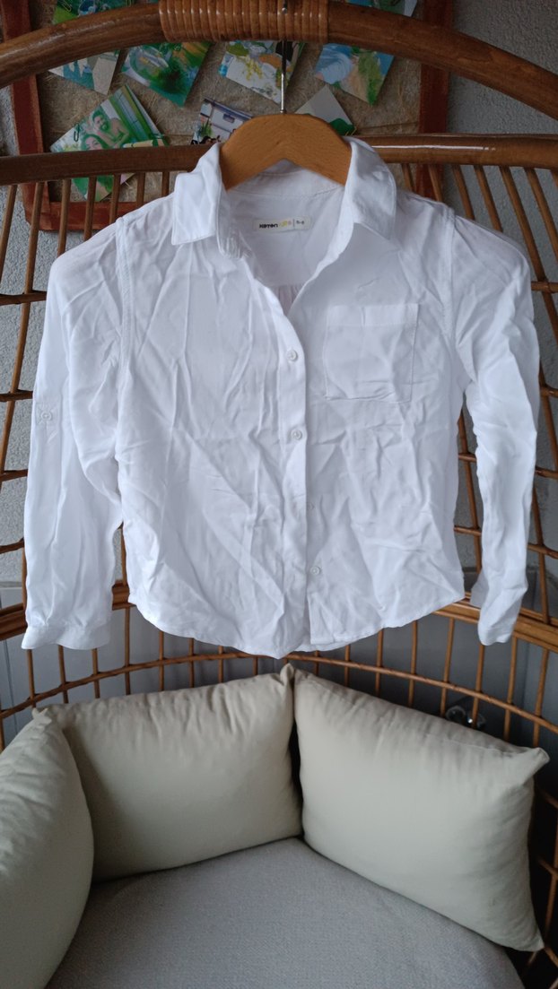 Uzun kollu, düğmeli ve yakalı cep detaylı beyaz keten gömlek. Rahat ve bol kesim, günlük kullanıma uygun.