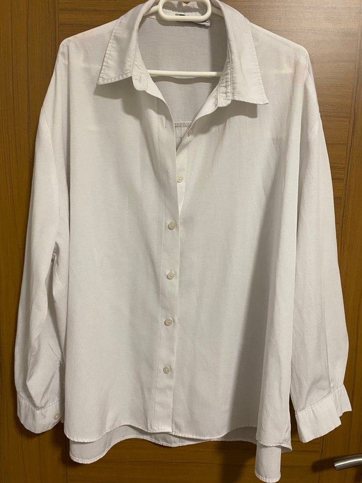 Beyaz keten kumaştan, düğmeli, yakalı ve uzun kollu, bol kesim kadın gömlek. Ofis için uygundur.