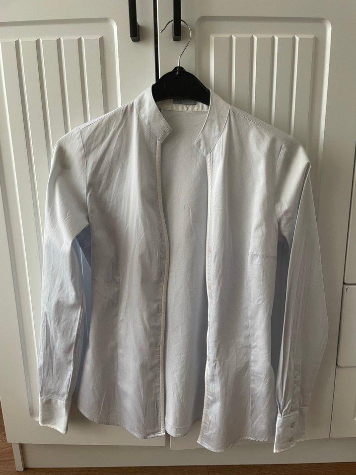 Kadınlar için beyaz keten gömlek, düğmeli ve yakalı. Uzun kollu, normal kesim ve midi boyda, ofis kullanımı için uygun.