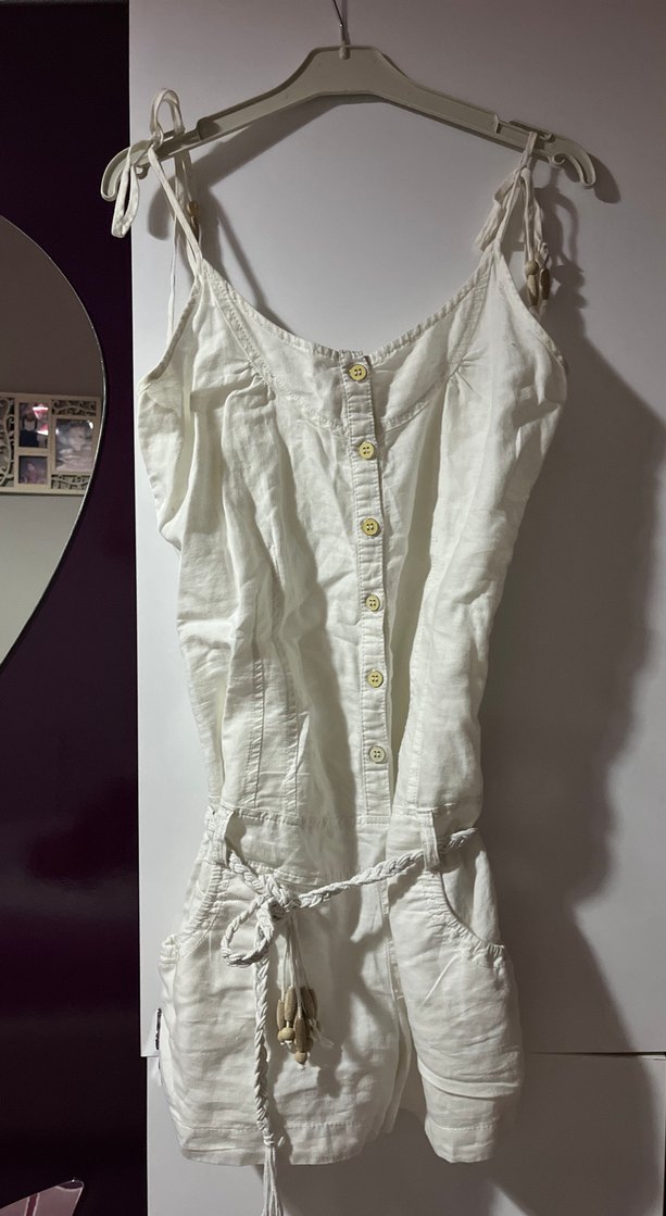 Kadın beyaz keten düğmeli midi tulum, straplez yaka ve bol kesimiyle günlük kullanım için bohem ve rahat bir stil sunar.