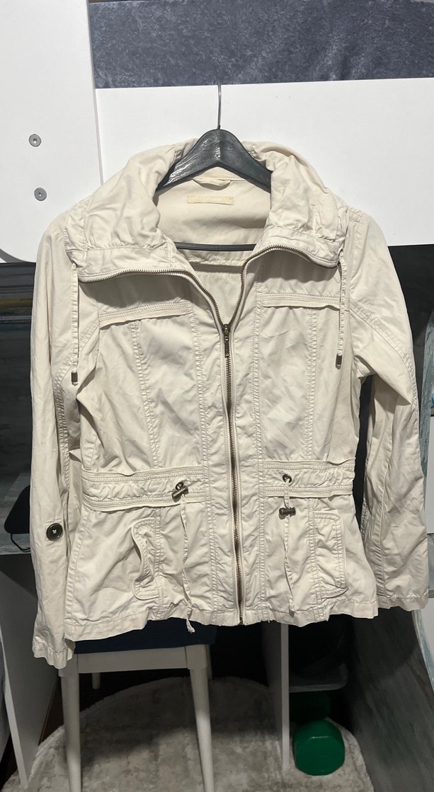 Krem keten ceket, fermuarlı ön ve oturan kesim, kesik yakalı ve uzun kollu, dış mekan gündelik kullanım için uygundur. Gögüz ölcüsü 90 cm