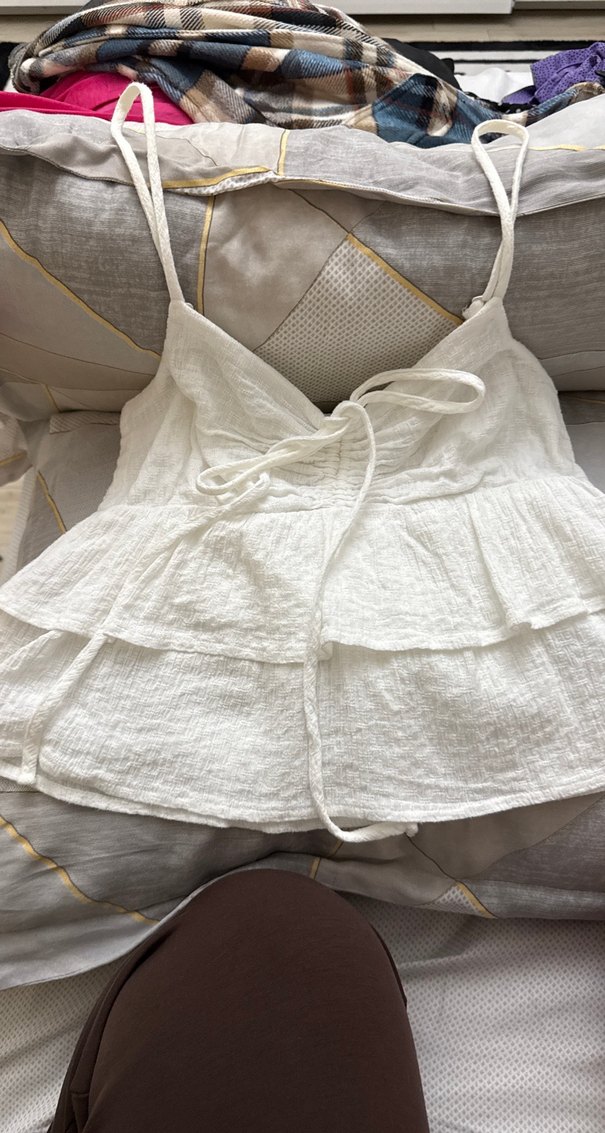 Beyaz keten askısız, fırfırlı detaylı, bol kesim ve midi boyda bohem tarzda kadın bluz. Hafif ve desensiz kumaştan, günlük kullanım için uygundur.