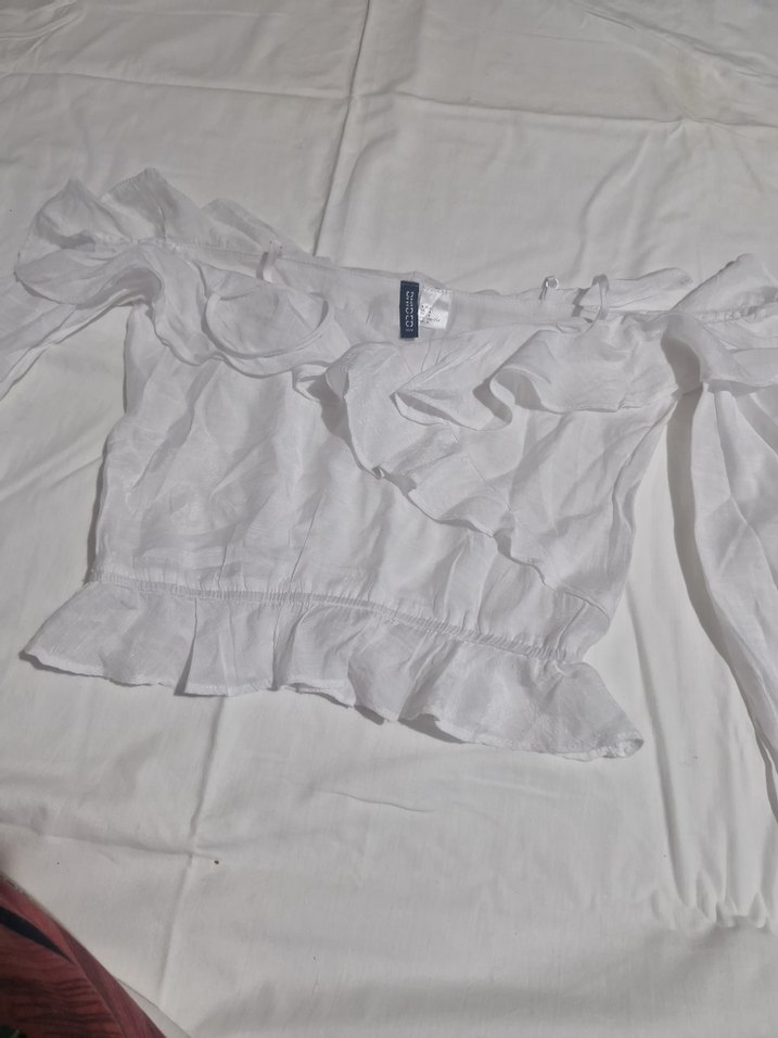 Kadın keten kumaştan, beyaz renkte, fırfır detaylı, kayık yaka ve kısa kollu bol kesim bluz. Sokak stiline uygun sade tasarım.