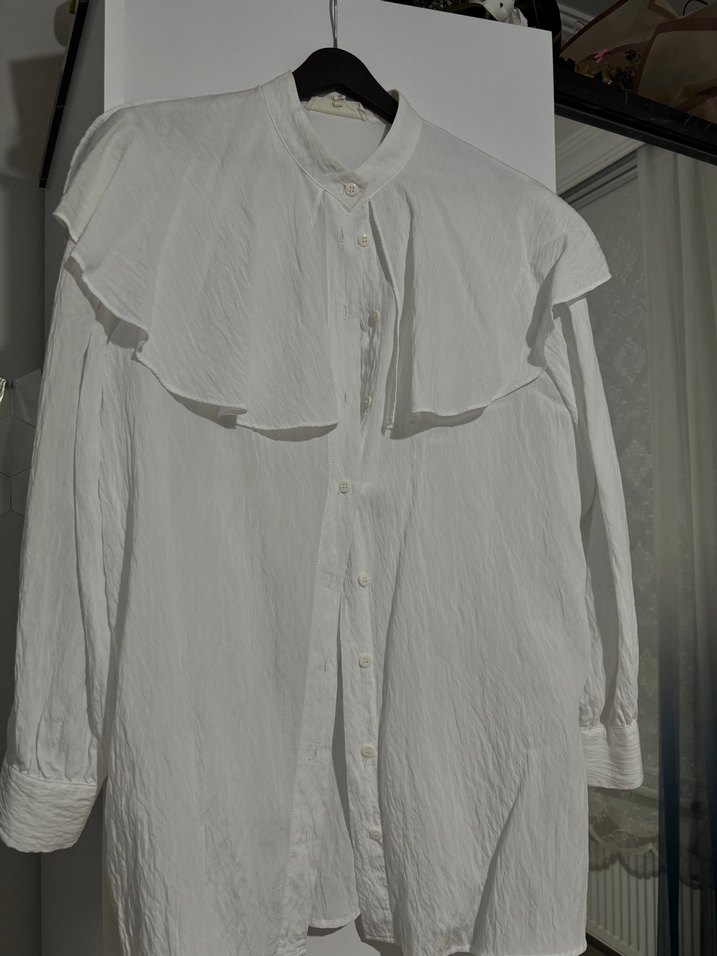 Beyaz keten kumaştan, yakalı ve fırfırlı detaylı, uzun kollu, bol kesim kadın gömleği. Trend casual tarz için uygundur.