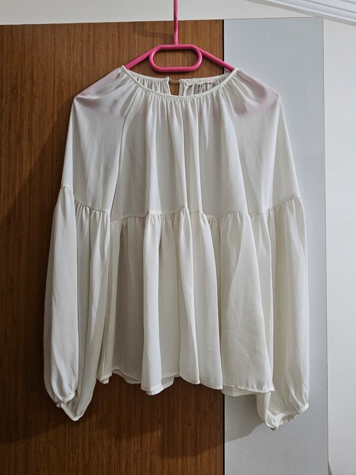 Beyaz keten kumaştan, uzun kollu ve fırfır detaylı, salaş kesimli, yuvarlak yakalı midi boy bluz. Minimalist ve bohem tarzda günlük kullanıma uygun.