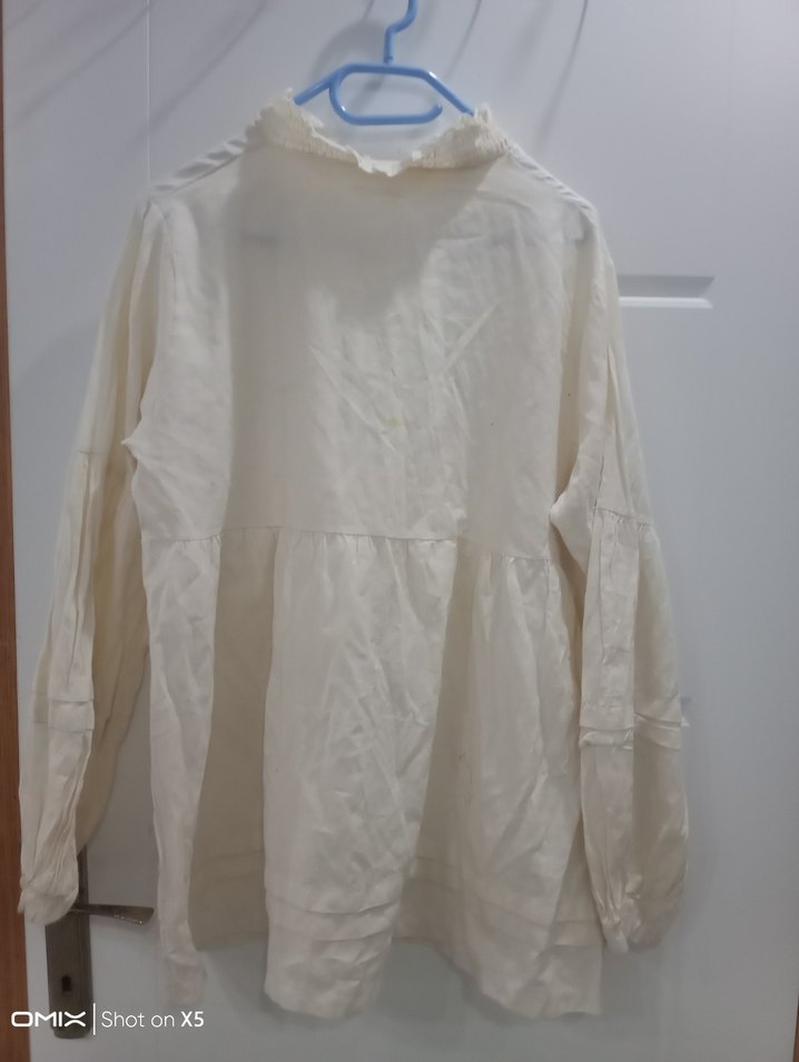 Beyaz keten, bol kesim, uzun kollu, yüksek yakalı ve fırfır detaylı gömlek. Minimalist ve bohem tarzda, günlük kullanıma uygun.
