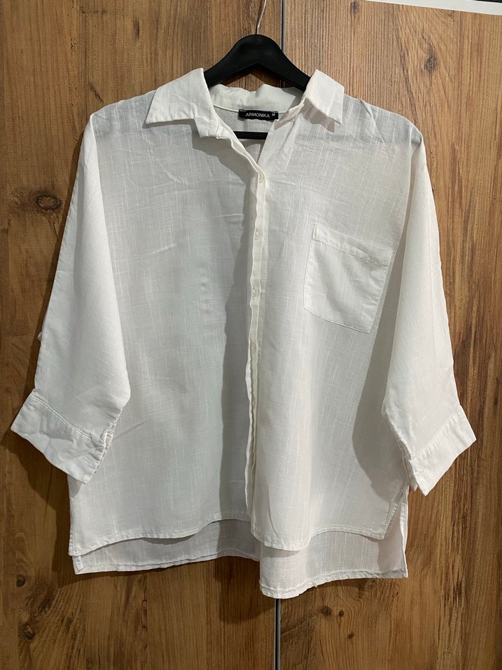 Kadınlar için beyaz keten gömlek, düğmeli ve kısa kolludur. Salaş kesimi, yakalı ve tek cep detaylıdır. Minimalist bohem tarzda, günlük kullanım için uygundur. Üründe hiçbir sorun yoktur az kullanıldı. M beden