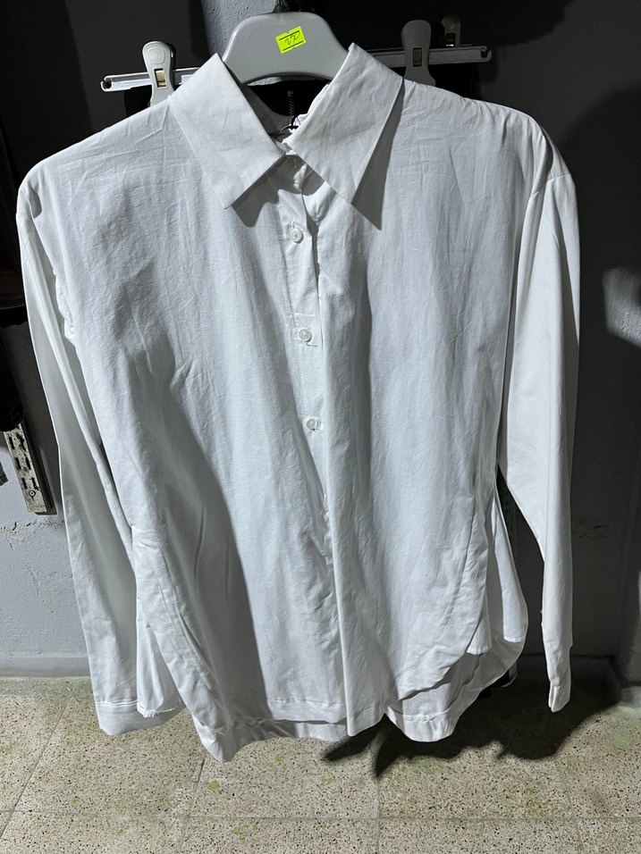 Uzun kollu, düğmeli yakalı beyaz keten kadın gömleği. Salaş kesimiyle günlük rahat kullanıma uygundur. Beden belirtiniz