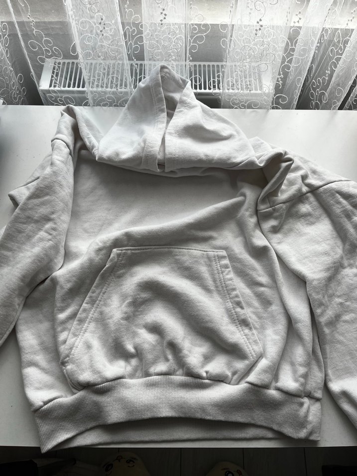 Kadınlar için beyaz keten kumaştan üretilmiş, kapüşonlu ve cep detaylı, salaş kesim uzun kollu sweatshirt. Günlük kullanıma uygun sade ve rahat bir parça. Hiç giyilmedi