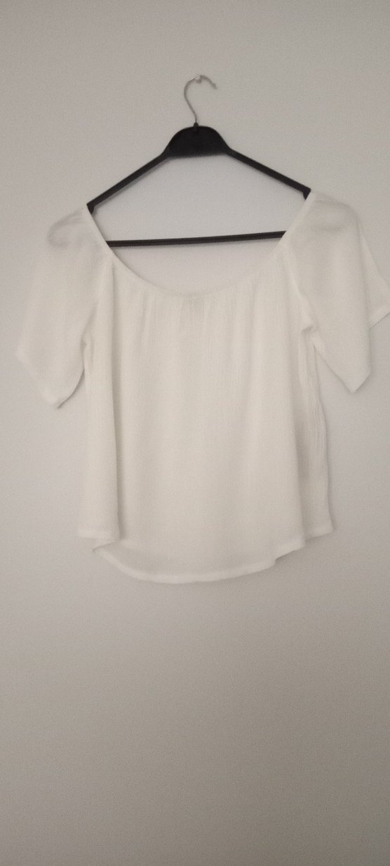 Beyaz keten kumaştan, kısa kollu ve kayık yaka, salaş kesimli günlük kullanıma uygun minimalist bluz.