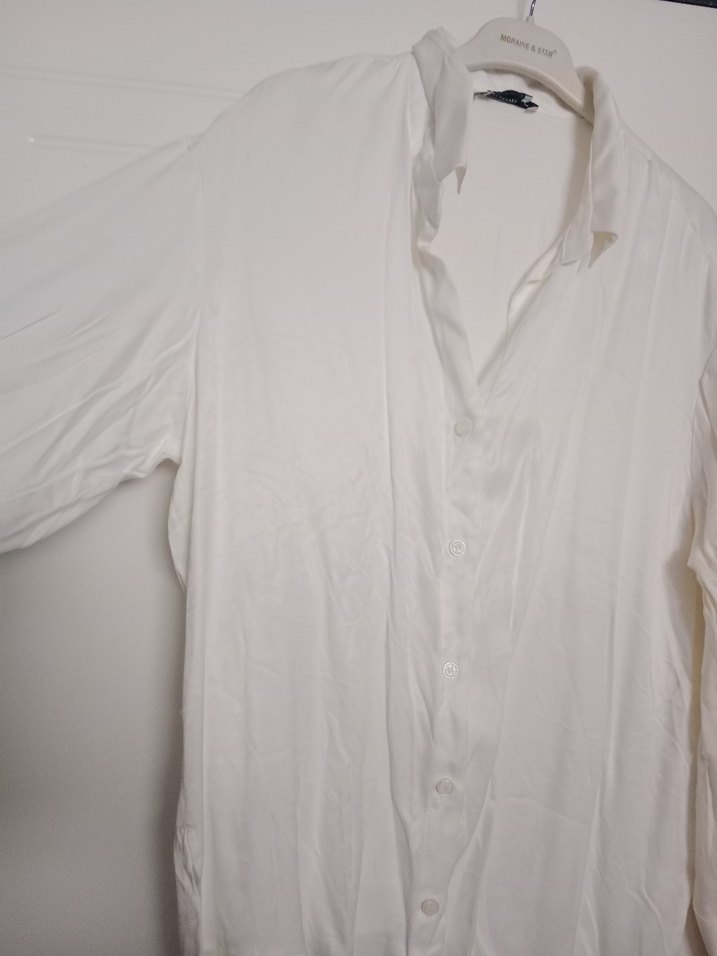 Beyaz keten kumaştan, kısa kollu, düğmeli ve yakalı, bol kesim minimalist kadın gömleği.