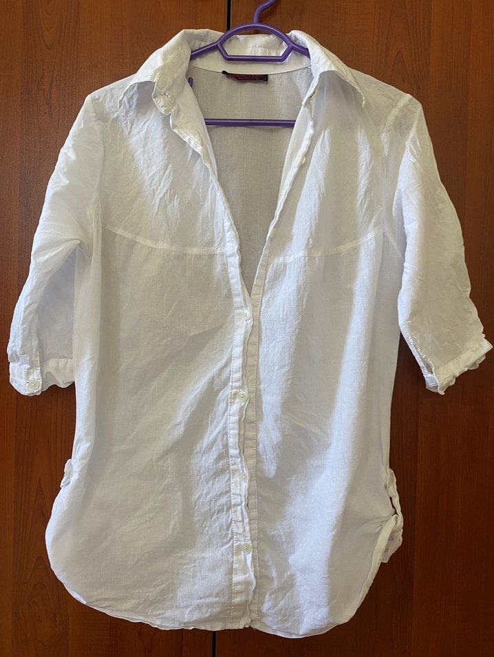 Kadınlar için keten kumaştan, yakalı ve düğmeli, kısa kollu gömlek. Salaş kesim ve midi boyda, sade ve bohem tarzda günlük kullanım için uygundur. L beden.