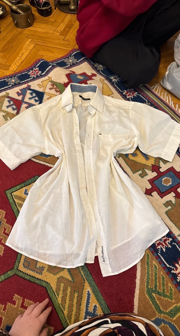 Kadınlar için beyaz keten gömlek, kısa kollu, yakalı ve düğmeli. Gevşek kesimi ve midi boyu ile bohem tarzını yansıtır.