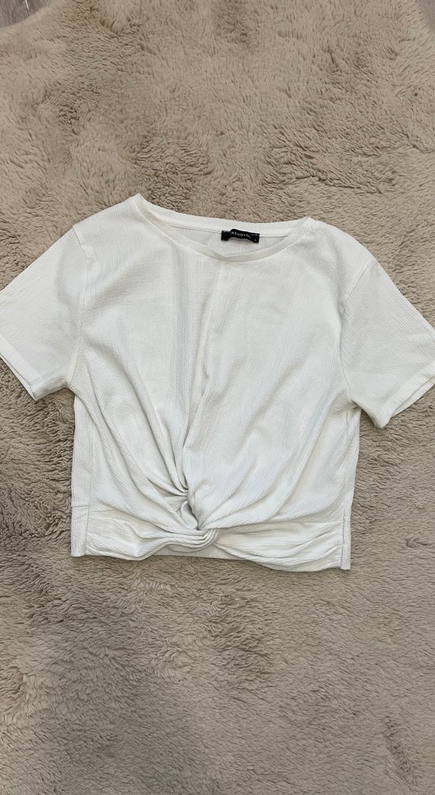 Kadın beyaz keten kısa kollu tişört, yuvarlak yakalı ve bol kesimdir. Ön kısmında sade bir düğüm detayı bulunur, günlük kullanıma uygundur. m-l uyumlu