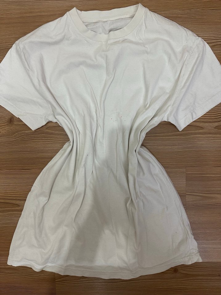 Beyaz keten kumaştan, kısa kollu, yuvarlak yakalı, salaş kesim ve desen içermeyen günlük kullanıma uygun tişört.