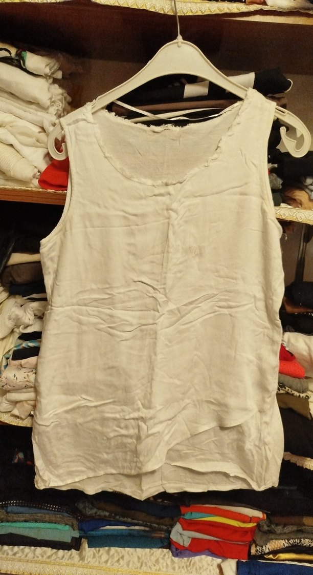 Kadın beyaz keten kolsuz tişört, yuvarlak yaka ve bol kesimlidir. Desensiz, bohem tarzda ve günlük kullanıma uygundur.