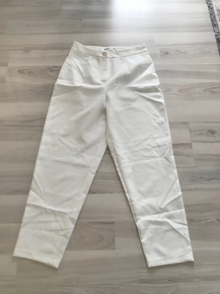 Kadınlar için regular fit, beyaz keten kumaştan yapılmış midi boy pantolon. Düz, desensiz ve minimalist normcore tarzda, günlük kullanıma uygun şık bir parça. Sıfır ürün hiç kullanılmadı rahat kesim internetten getirttim olmadı bana ondan satıyorum hiç giyilmedi