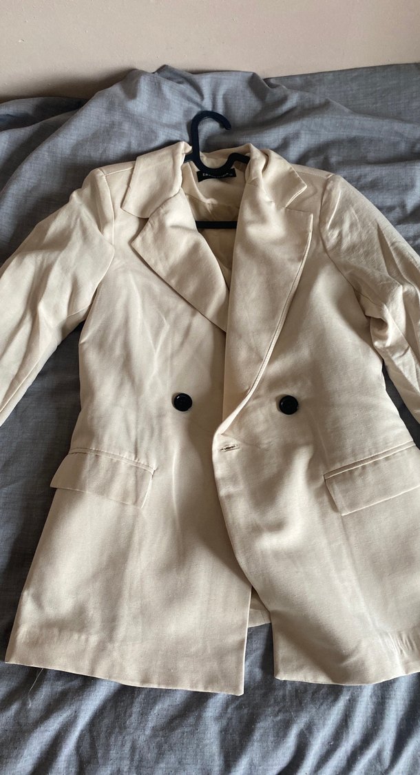 Kadınlar için keten kumaştan, beyaz renkte, normal uzunlukta, düğmeli, uzun kollu ve klasik yaka blazer ceket. Ofis ve günlük kullanıma uygun.