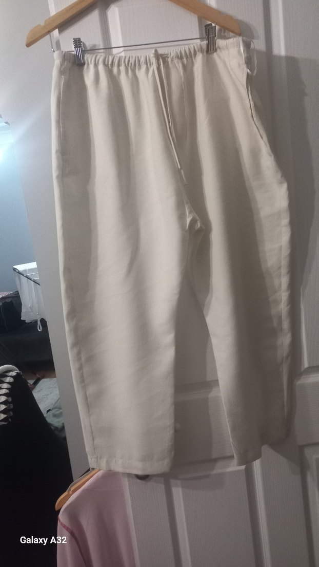 Kadınlar için beyaz keten pantolon, bol kesim ve midi boy ile rahat ve şık bir görünüm sunar. Düz ve desensiz, günlük,ofis,eglence kullanıma uygundur.