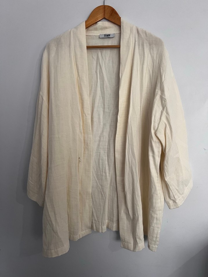 Kadınlar için loose fit kesim, uzun kollu, keten kumaştan beyaz midi boyda, drapeli ve notch yakalı minimalist bohem kimono.