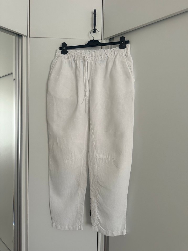 Beyaz keten kumaştan, lastikli ve bağcıklı midi boy bol kesim pantolon. Desensiz, minimal ve zahmetsiz şıklık sunar.