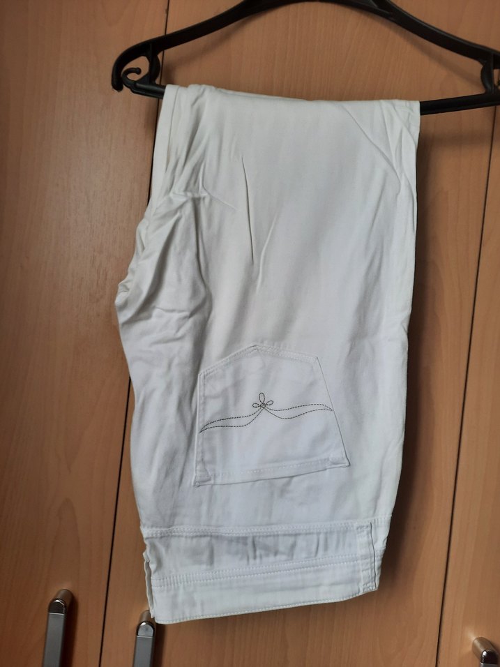 Kadın beyaz keten midi pantolon, bol kesim ve fermuarlı detaylara sahip, rahat sokak stili için uygun.