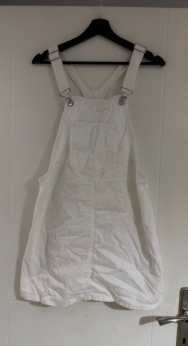 Düğmeli, askısız yaka, bol kesim beyaz keten midi salopet, minimalist tarzda günlük kullanıma uygun. boyu 83 cm