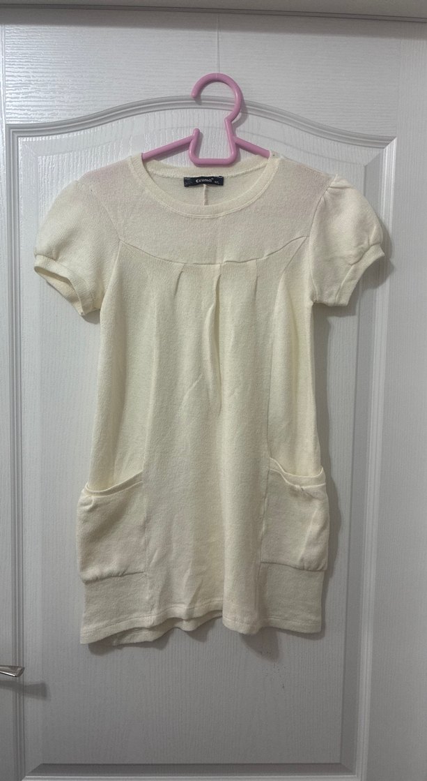 Keten kumaştan, kısa kollu, yuvarlak yakalı, bol kesim beyaz midi triko elbise. İki ön cep ve gündelik sokak stili için uygundur. Krem rengi yumuşacık çok hafif tatliş bir kazak altına taytla süper duruyor hiçbir sorunu yok yepyeni hiç kullanmadıms ve m ben için uygundur