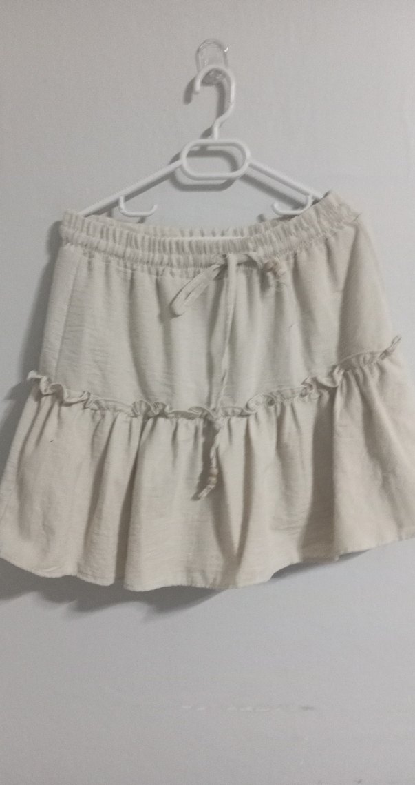 Kadınlar için beyaz renkli keten kumaştan, bol kesim ve fırfır detaylı mini etek. Belinde bağcık bulunur, bohem ve minimal tarzda günlük kullanıma uygundur.