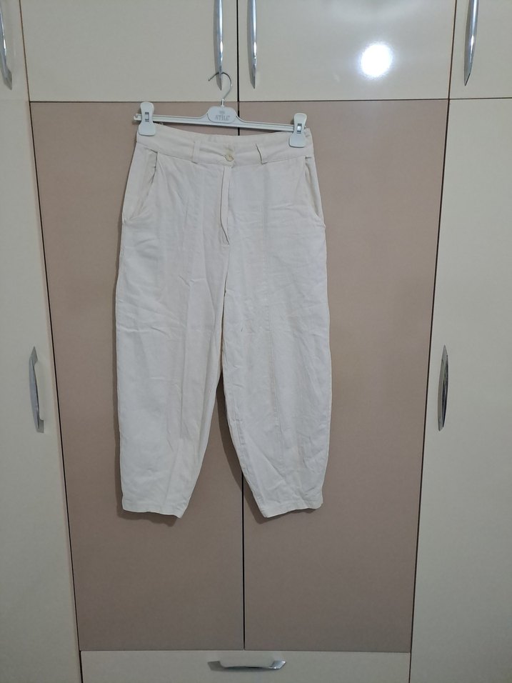 Kadınlar için beyaz keten mini uzunlukta, bol kesim rahat pantolon. Günlük kullanım için zahmetsiz şıklık ve konfor sunar.