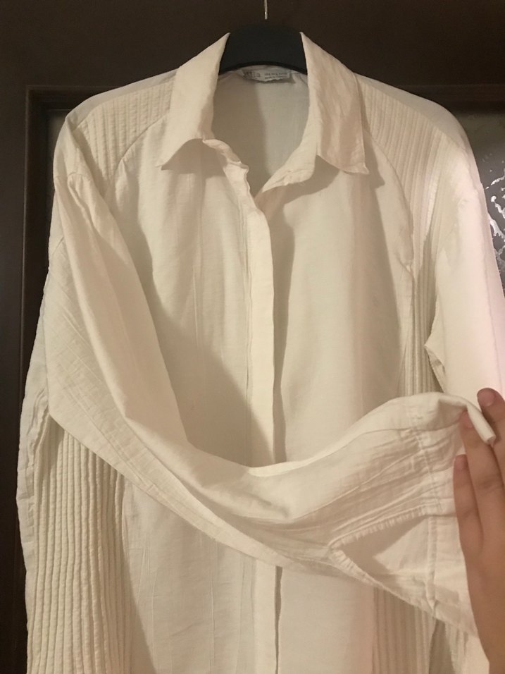 Beyaz keten, pileli detaylı, uzun kollu, yakalı ve bol kesim midi uzunluğunda kadın gömleği. Günlük kullanım için sade, bohem tarzda. Marka temsilidir